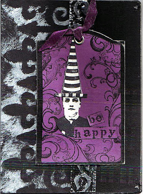 Thought I would make a Halloween card for a change featuring my fav colour purple. The background is made up of stencilled painted papers and embossed foil that I made earlier in the week. The tomb shaped tag features various stamped images, ribbon and the words Be Happy as she looks such a bundle of laughs!!
